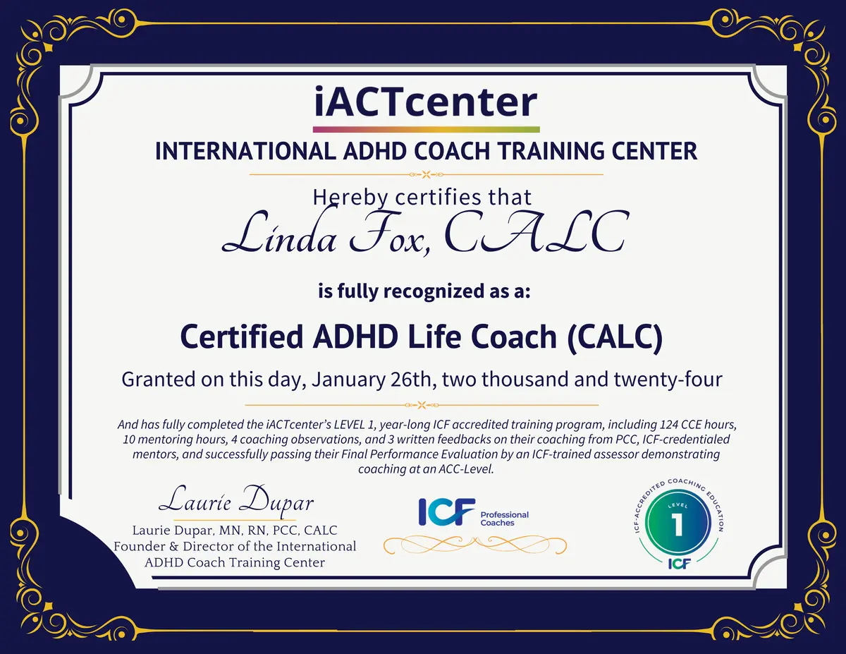 - Certified ADHD Life Coach (CALC) through iACT, a year-long specialist ADHD coach training programme