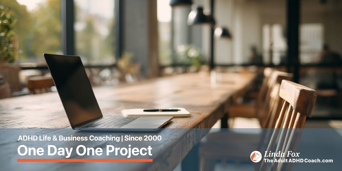 One Day One Project is a focused small-group action day (max 6-8 people) designed for ADHD brains. You get my individual attention throughout. You bring one project you’ve been putting off, and by the end of the day, you have moved it forward meaningfully.